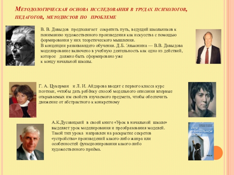 А.К.Дусавицкий в своей книге «Урок в начальной школе» выделяет урок моделирования и преобразования моделей. Такой тип урока направлен на раскрытие секретов «устройства» произведений какого-либо жанра или особенностей функционирования какого-либо художественного приёма.