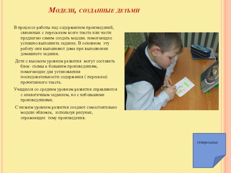 В процессе работы над содержанием произведений, связанных с пересказом всего текста или части предлагаю самим создать модели. помогающие успешно выполнить задание. В основном эту работу они выполняют дома при выполнении домашнего задания.