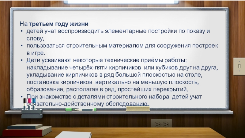 Дети усваивают некоторые технические приёмы работы: накладывание четырёх-пяти кирпичиков или кубиков друг на друга, укладывание кирпичиков в ряд большой плоскостью на столе, постановка кирпичиков вертикально на меньшую плоскость, образование, располагая в ряд, простейших перекрытий.