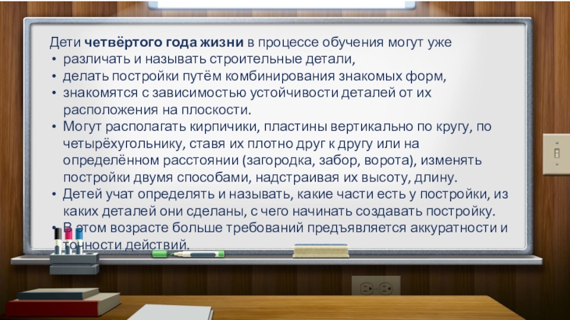 Детей учат определять и называть, какие части есть у постройки, из каких деталей они сделаны, с чего начинать создавать постройку.