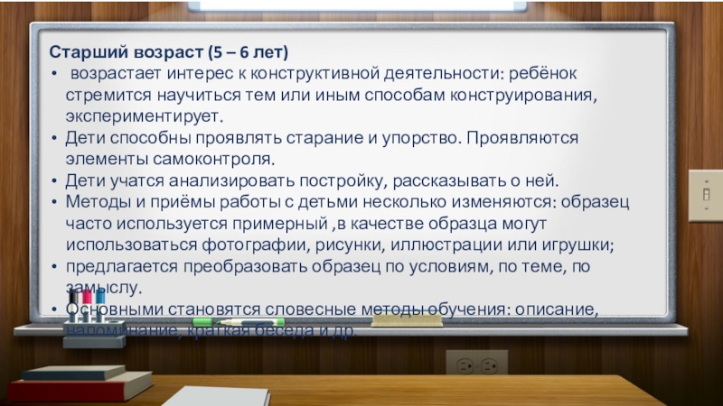 Основными становятся словесные методы обучения: описание, напоминание, краткая беседа и др.
