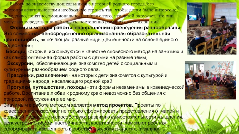 Год от года оно расширяется, обогащается, совершенствуется. Большое значения для формирования, расширения и углубления представлений о родном крае, патриотических чувств, воспитания любви к родному краю имеет применение в учебно-воспитательном процессе местного краеведческого материала. Дошкольников полезно знакомить с успехами родного им края, так как сведения краеведческого характера более близки и понятны им и вызывают у них познавательный интерес.