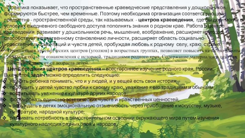 Слайд 8 Практика показывает, что пространственные краеведческие представления у дошкольников формируются быстрее,