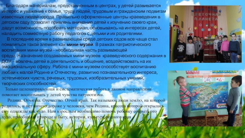 чем временные. Поэтому необходима организация соответствующей предметно - пространственной среды, так называемых - центров краеведения, где бы дети могли в условиях ежедневного свободного доступа пополнять знания о родном крае. Работа в центре краеведения развивает у дошкольников речь, мышление, воображение, расширяет кругозор, способствует нравственному становлению личности, расширяет область социально-нравственных ориентаций и чувств детей, пробуждая любовь к родному селу, краю, стране.