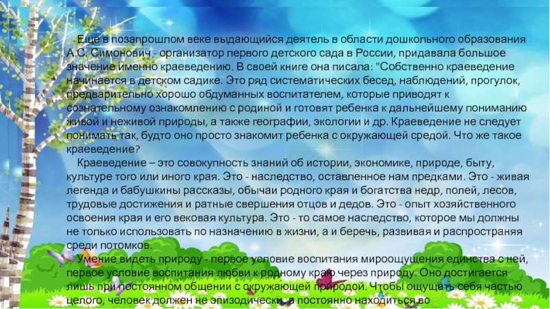 образования А.С. Симонович - организатор первого детского сада в России, придавала большое значение именно краеведению. В своей книге она писала: "Собственно краеведение начинается в детском садике. Это ряд систематических бесед, наблюдений, прогулок, предварительно хорошо обдуманных воспитателем, которые приводят к сознательному ознакомлению с родиной и готовят ребенка к дальнейшему пониманию живой и неживой природы, а также географии, экологии и др. Краеведение не следует понимать так, будто оно просто знакомит ребенка с окружающей средой. Что же такое краеведение?