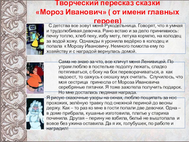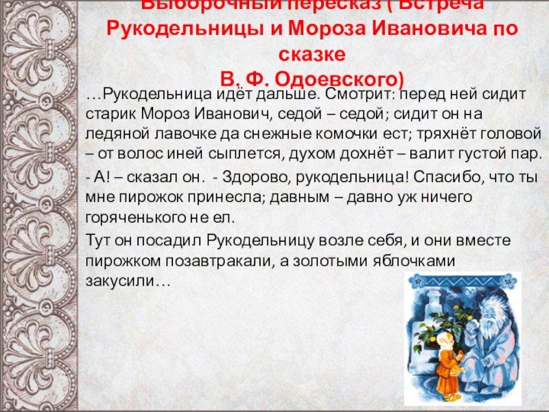 …Рукодельница идёт дальше. Смотрит: перед ней сидит старик Мороз Иванович, седой – седой; сидит он на ледяной лавочке да снежные комочки ест; тряхнёт головой – от волос иней сыплется, духом дохнёт – валит густой пар.