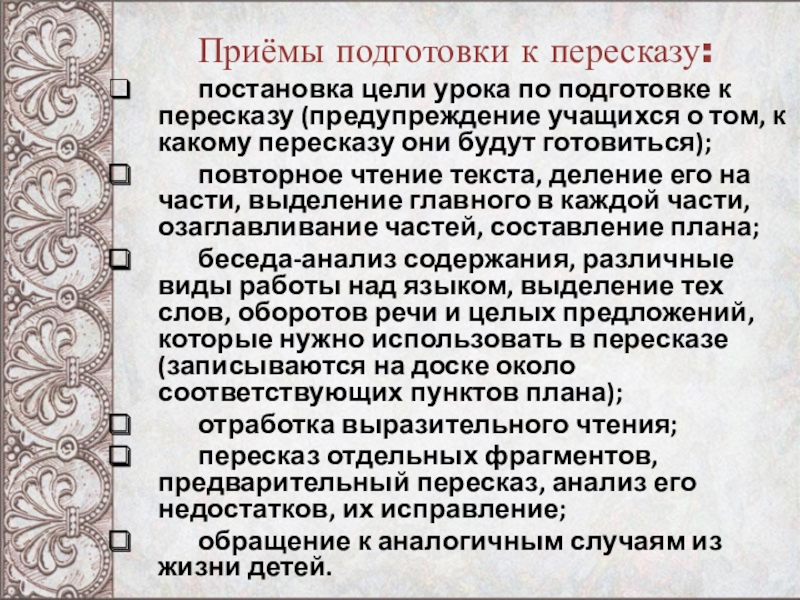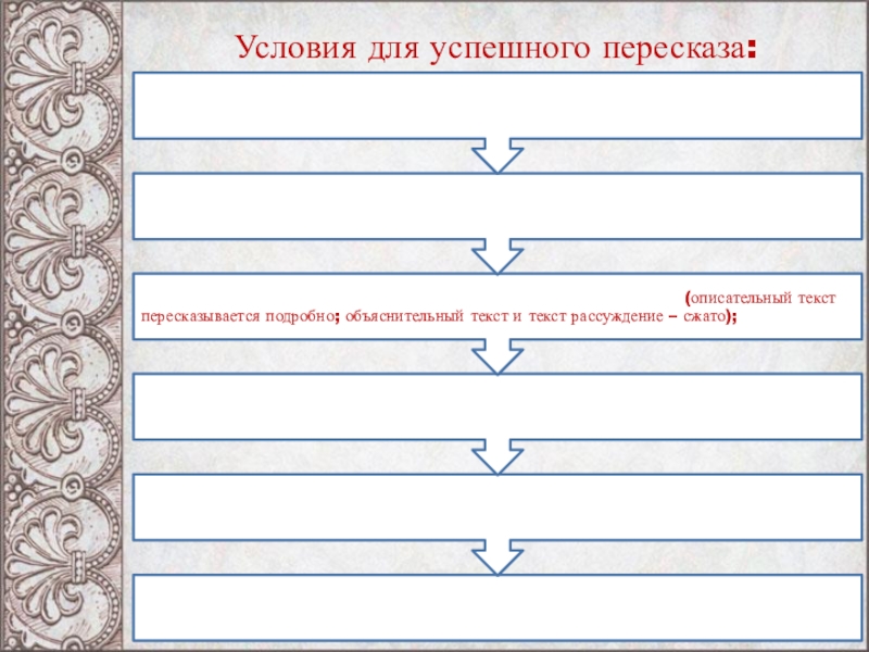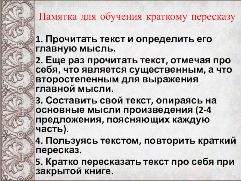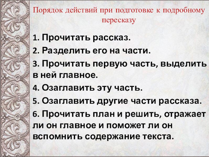использовать различные опоры в виде планов пересказа: вопросный план, цитатный план, иллюстративный план (рисунки, слайды), схематичный план, символический условно-графический план, план из опорных слов или предложений, план из озаглавленных частей текста и т.п.