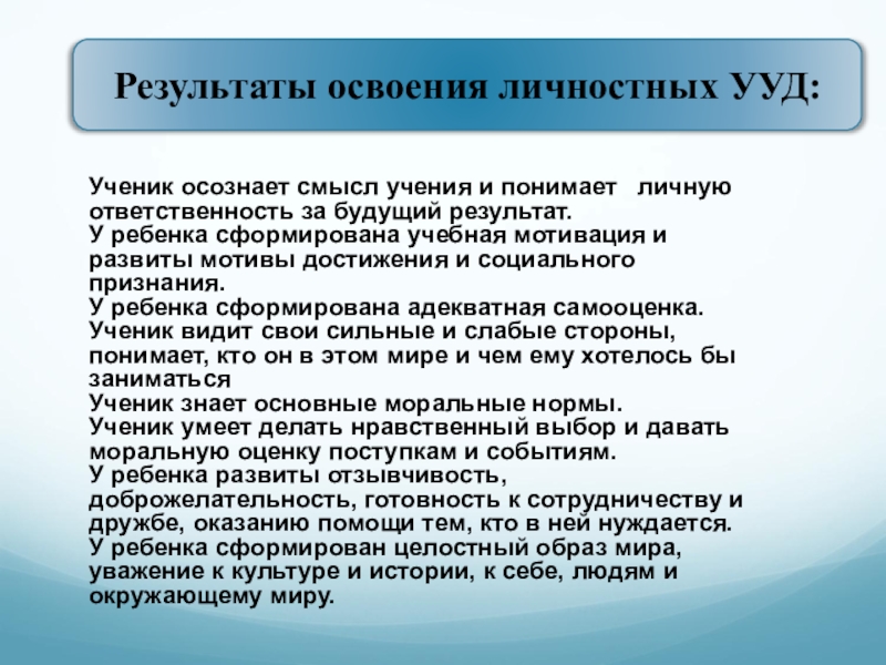 Результаты освоения личностных УУД: