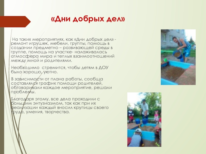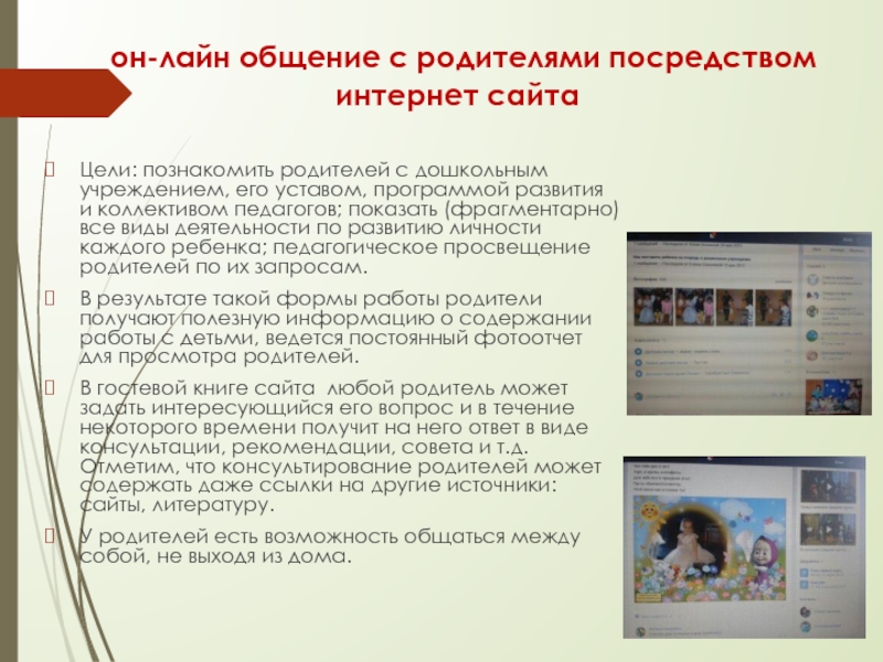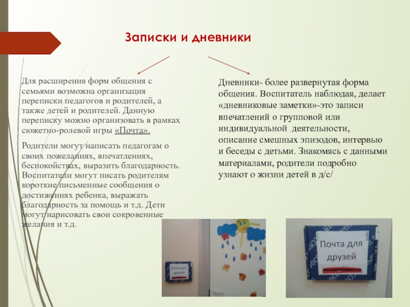 Дневники- более развернутая форма общения. Воспитатель наблюдая, делает «дневниковые заметки»-это записи впечатлений о групповой или индивидуальной деятельности, описание смешных эпизодов, интервью и беседы с детьми. Знакомясь с данными материалами, родители подробно узнают о жизни детей в д/c/