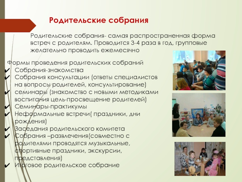 Собрания –развлечения(совместно с родителями проводятся музыкальные, спортивные праздники, экскурсии, представления)