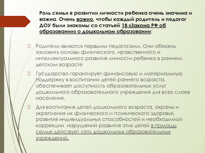 Роль семьи в развитии личности ребенка очень значима и важна. Очень важно, чтобы каждый родитель и педагог ДОУ были знакомы со статьей 18 «Закона РФ об образовании» о дошкольном образовании: