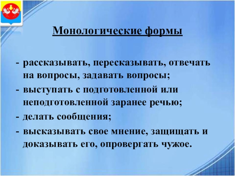 рассказывать, пересказывать, отвечать на вопросы, задавать вопросы;
