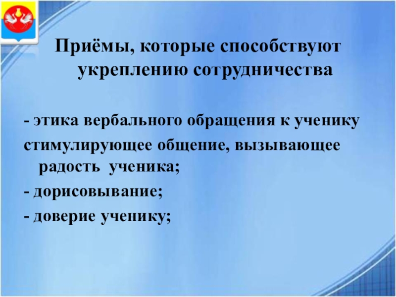 Слайд 11Приёмы, которые способствуют укреплению сотрудничества