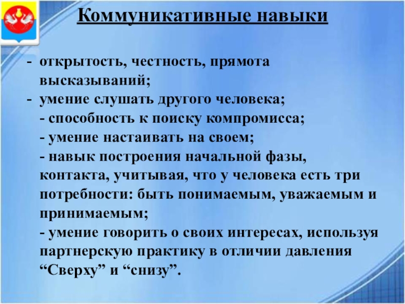 - умение говорить о своих интересах, используя партнерскую практику в отличии давления “Сверху” и “снизу”.
