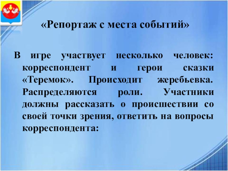 герои сказки «Теремок». Происходит жеребьевка. Распределяются роли. Участники должны рассказать о происшествии со своей точки зрения, ответить на вопросы корреспондента: