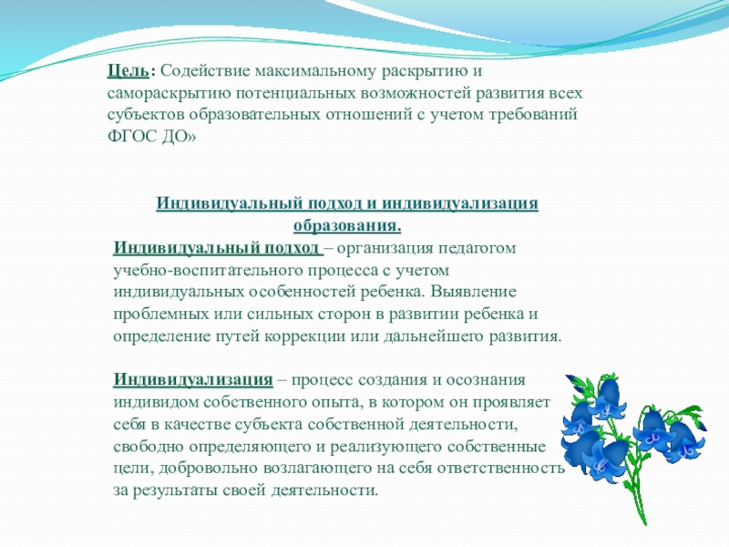 Индивидуализация – процесс создания и осознания индивидом собственного опыта, в котором он проявляет себя в качестве субъекта собственной деятельности, свободно определяющего и реализующего собственные цели, добровольно возлагающего на себя ответственность за результаты своей деятельности.