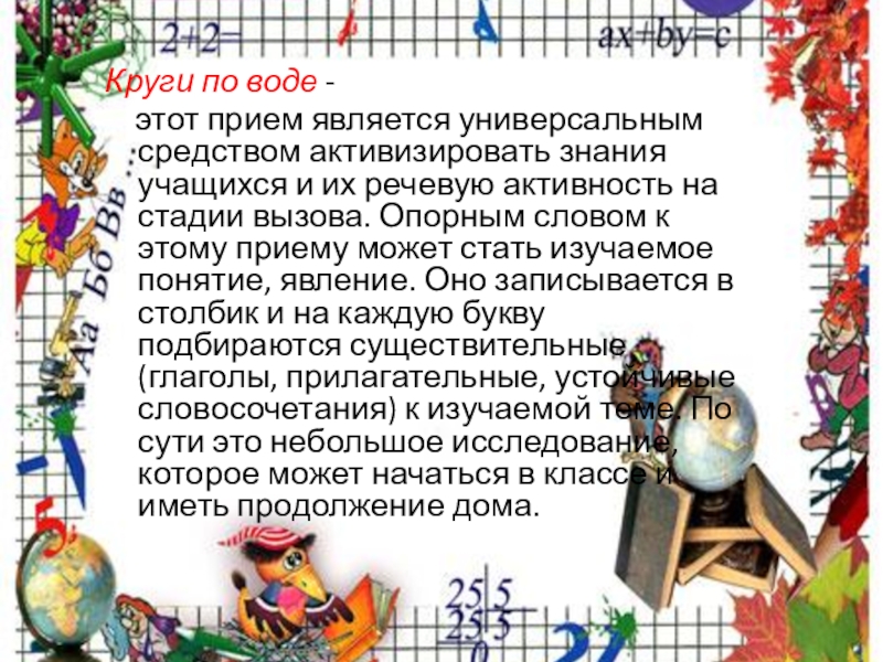 знания учащихся и их речевую активность на стадии вызова. Опорным словом к этому приему может стать изучаемое понятие, явление. Оно записывается в столбик и на каждую букву подбираются существительные (глаголы, прилагательные, устойчивые словосочетания) к изучаемой теме. По сути это небольшое исследование, которое может начаться в классе и иметь продолжение дома.