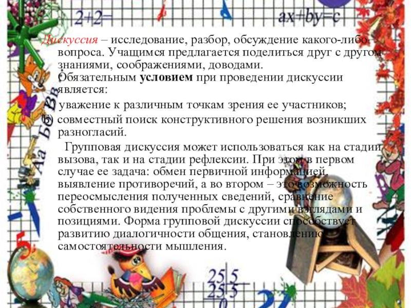 Слайд 11Дискуссия – исследование, разбор, обсуждение какого-либо вопроса. Учащимся предлагается поделиться друг