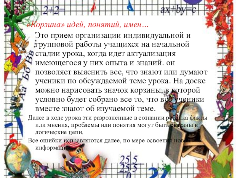 работы учащихся на начальной стадии урока, когда идет актуализация имеющегося у них опыта и знаний. он позволяет выяснить все, что знают или думают ученики по обсуждаемой теме урока. На доске можно нарисовать значок корзины, в которой условно будет собрано все то, что все ученики вместе знают об изучаемой теме.