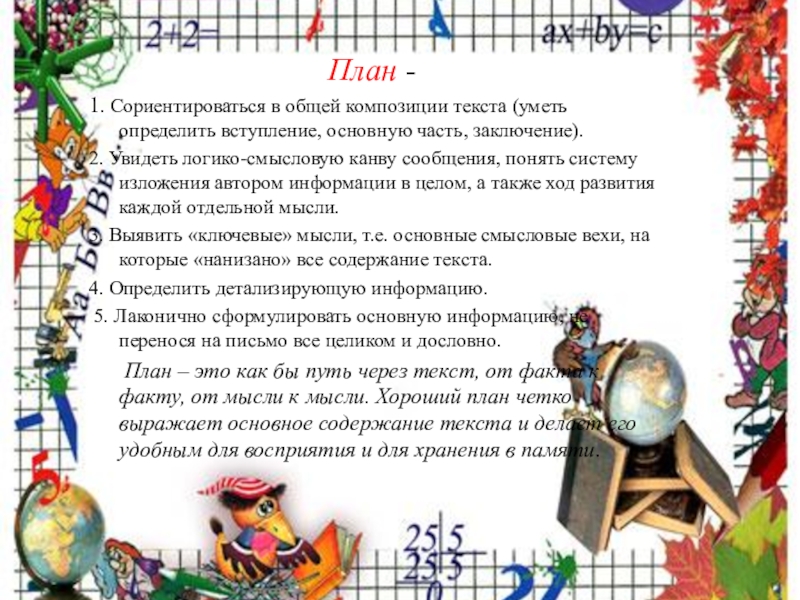 План – это как бы путь через текст, от факта к факту, от мысли к мысли. Хороший план четко выражает основное содержание текста и делает его удобным для восприятия и для хранения в памяти.