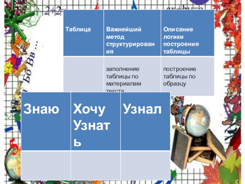 столбцов и строк. Создание таблиц – важнейший метод структурирования, полезный как на стадии осмысления, так и переработки материала.