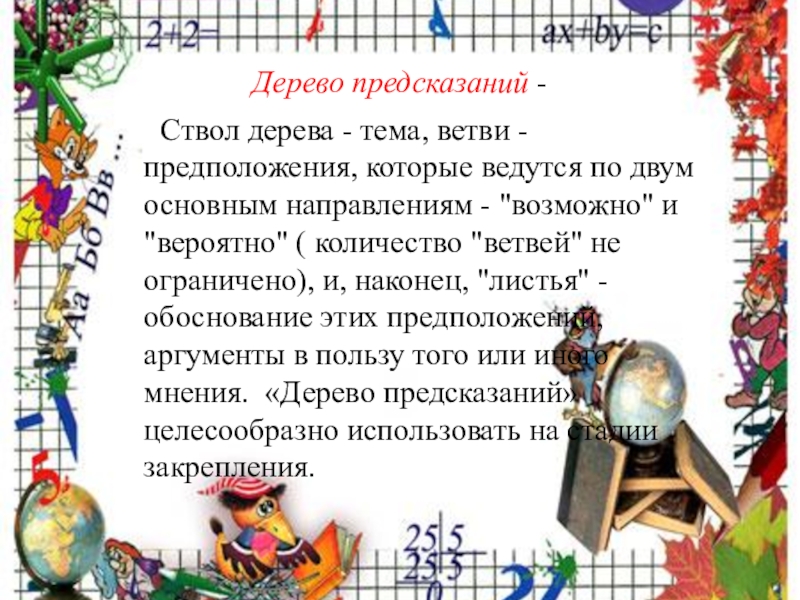 - предположения, которые ведутся по двум основным направлениям - "возможно" и "вероятно" ( количество "ветвей" не ограничено), и, наконец, "листья" - обоснование этих предположений, аргументы в пользу того или иного мнения. «Дерево предсказаний» целесообразно использовать на стадии закрепления.