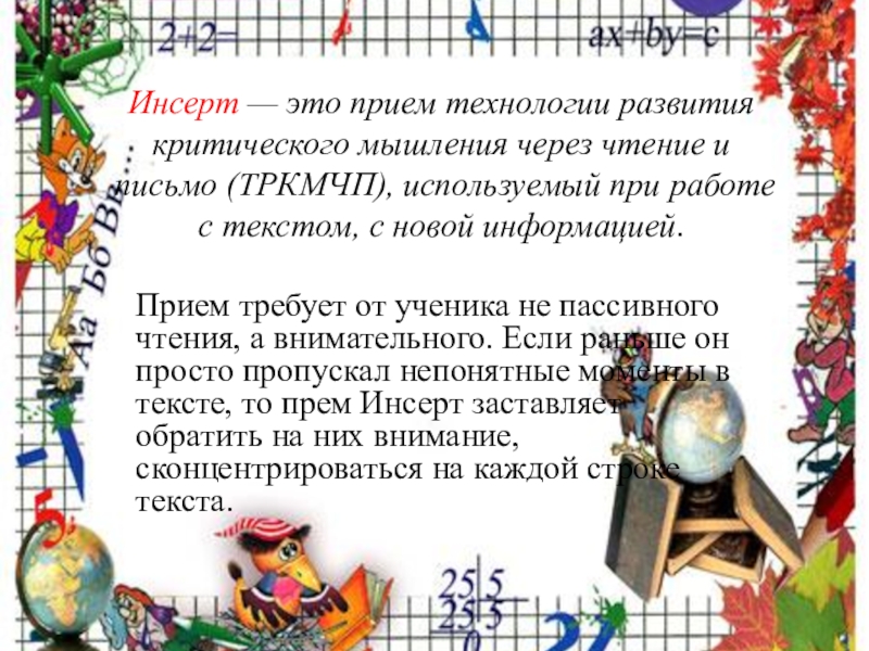 Слайд 7Инсерт — это прием технологии развития критического мышления через чтение и