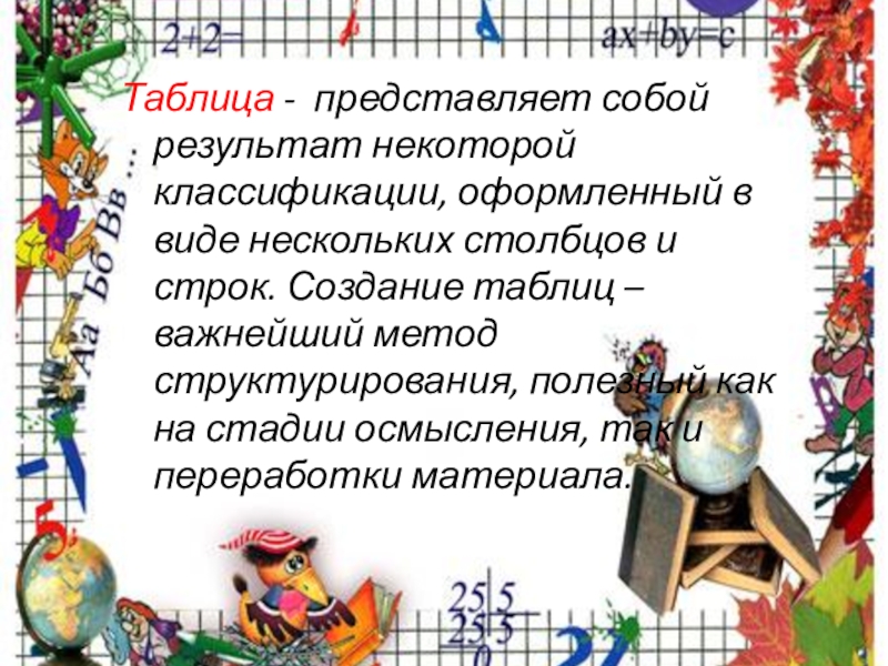 Слайд 4Таблица - представляет собой результат некоторой классификации, оформленный в виде нескольких