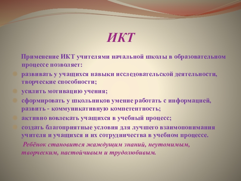 Применение ИКТ учителями начальной школы в образовательном процессе позволяет: