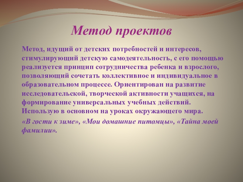 детскую самодеятельность, с его помощью реализуется принцип сотрудничества ребенка и взрослого, позволяющий сочетать коллективное и индивидуальное в образовательном процессе. Ориентирован на развитие исследовательской, творческой активности учащихся, на формирование универсальных учебных действий. Использую в основном на уроках окружающего мира.