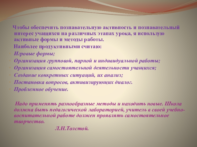 Слайд 14 Чтобы обеспечить познавательную активность и познавательный интерес учащихся на