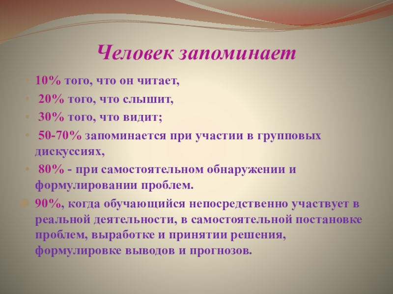 50-70% запоминается при участии в групповых дискуссиях,
