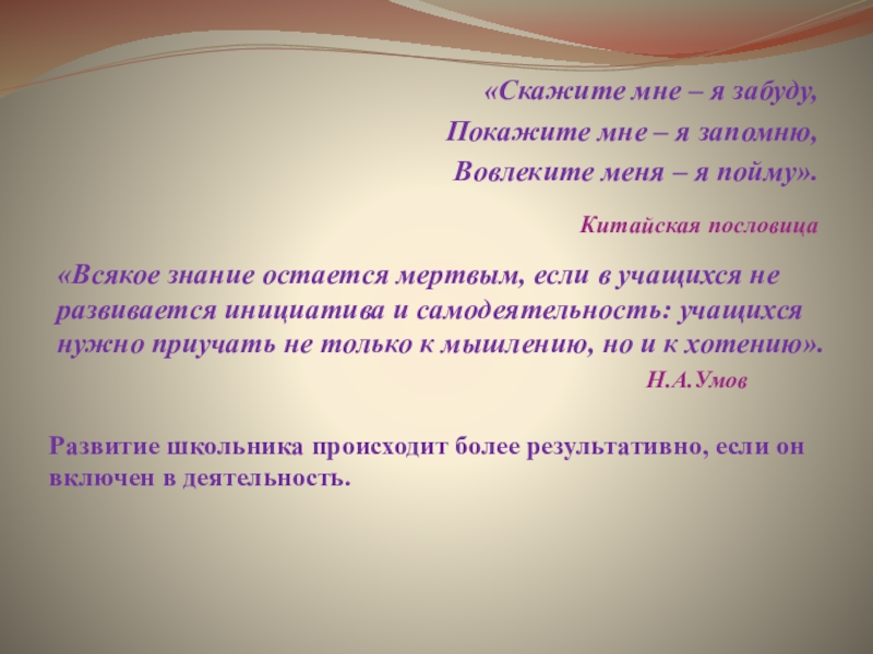 Развитие школьника происходит более результативно, если он включен в деятельность.
