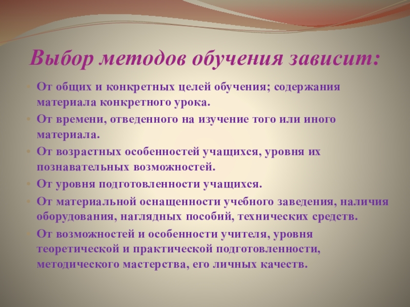 Слайд 7Выбор методов обучения зависит: