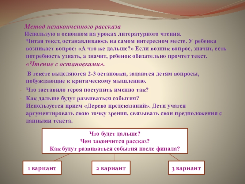 Как дальше будут развиваться события? Используется прием «Дерево предсказаний». Дети учатся аргументировать свою точку зрения, связывать свои предположения с данными текста.
