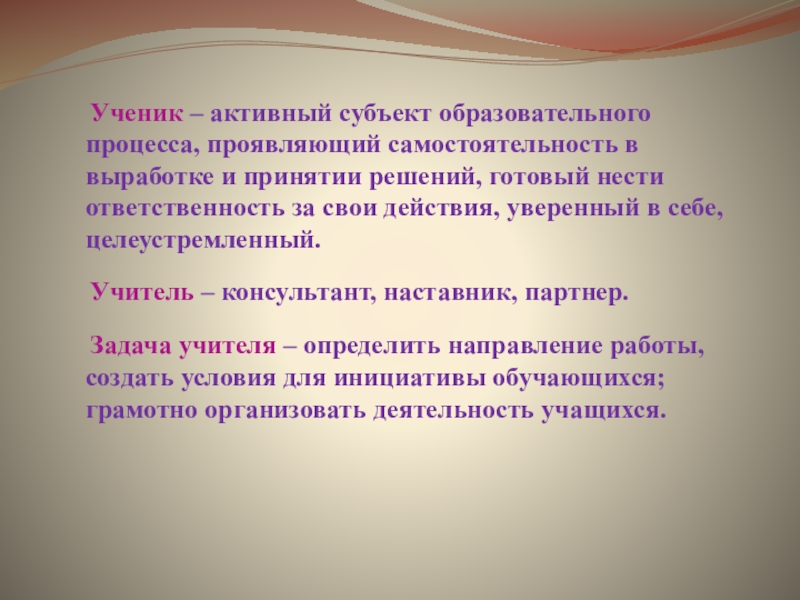 Слайд 10 Ученик – активный субъект образовательного процесса, проявляющий самостоятельность