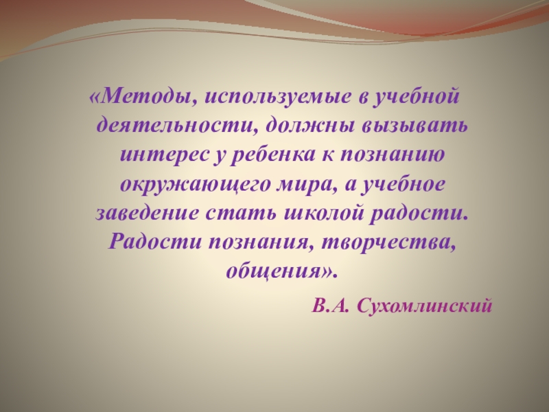 деятельности, должны вызывать интерес у ребенка к познанию окружающего мира, а учебное заведение стать школой радости. Радости познания, творчества, общения».