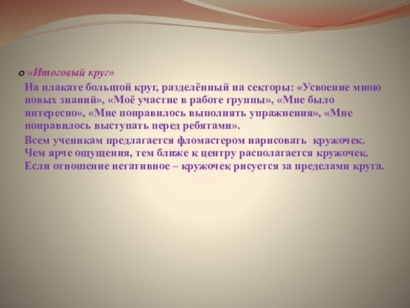 Всем ученикам предлагается фломастером нарисовать кружочек. Чем ярче ощущения, тем ближе к центру располагается кружочек. Если отношение негативное – кружочек рисуется за пределами круга.