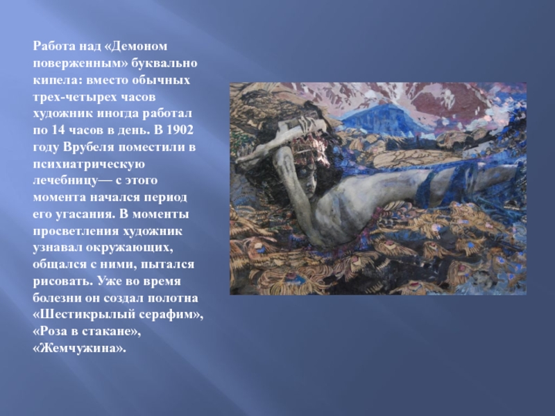 Слайд 11Работа над «Демоном поверженным» буквально кипела: вместо обычных трех-четырех часов художник