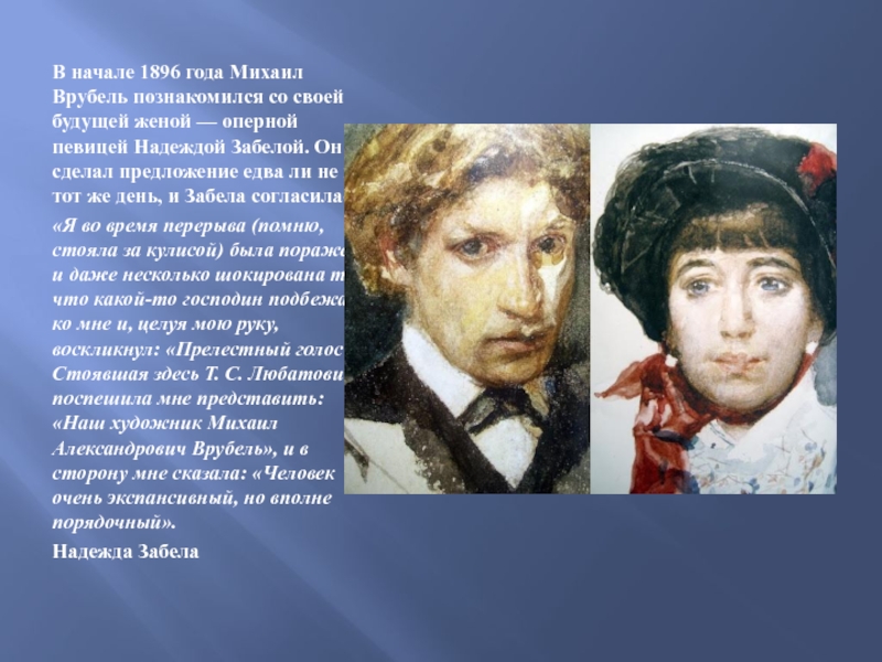 Слайд 9В начале 1896 года Михаил Врубель познакомился со своей будущей женой
