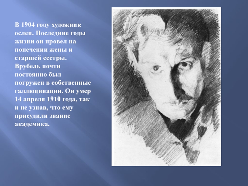 Слайд 12В 1904 году художник ослеп. Последние годы жизни он провел на