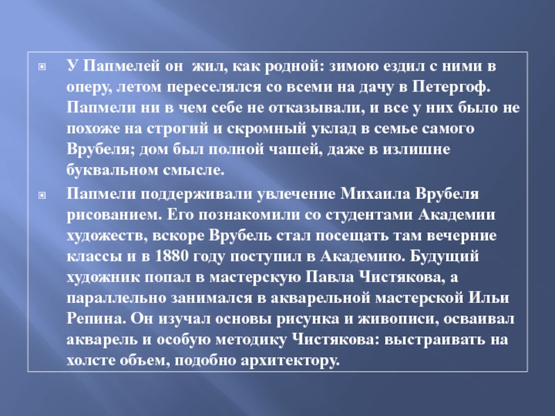 оперу, летом переселялся со всеми на дачу в Петергоф. Папмели ни в чем себе не отказывали, и все у них было не похоже на строгий и скромный уклад в семье самого Врубеля; дом был полной чашей, даже в излишне буквальном смысле.