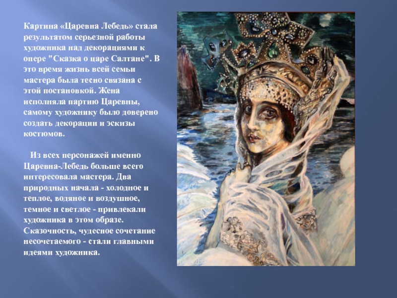 Слайд 14Картина «Царевна Лебедь» стала результатом серьезной работы художника над декорациями к