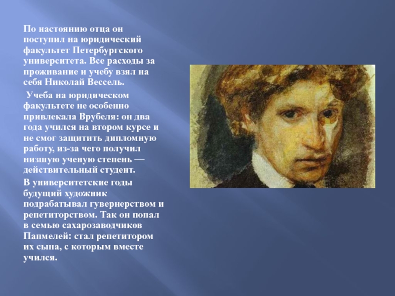 Учеба на юридическом факультете не особенно привлекала Врубеля: он два года учился на втором курсе и не смог защитить дипломную работу, из-за чего получил низшую ученую степень — действительный студент.