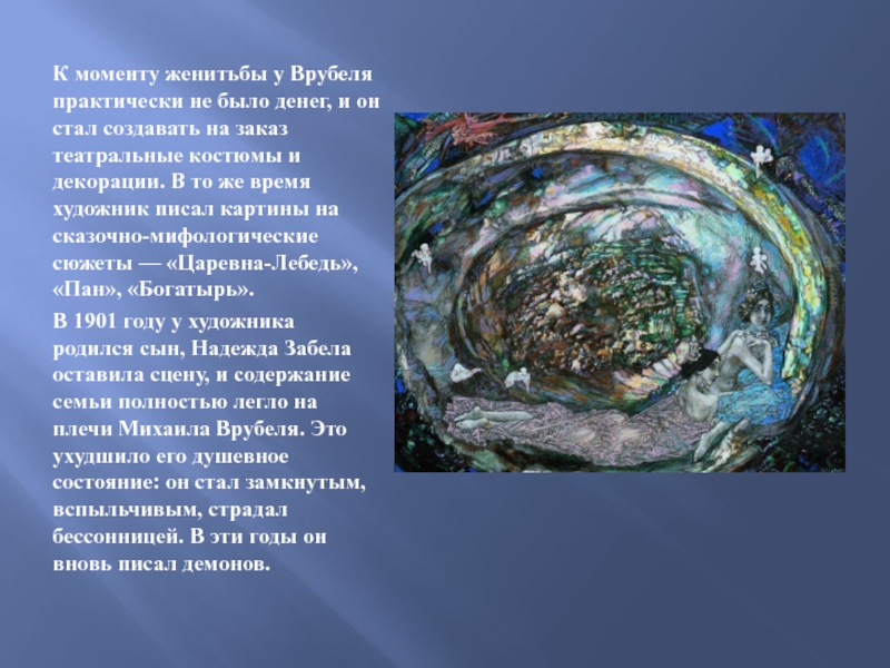 Слайд 10К моменту женитьбы у Врубеля практически не было денег, и он