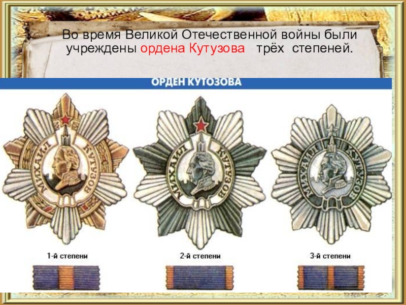 Слайд 34Во время Великой Отечественной войны были учреждены ордена Кутузова трёх