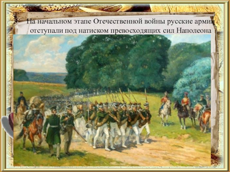 Слайд 8На начальном этапе Отечественной войны русские армии отступали под натиском превосходящих