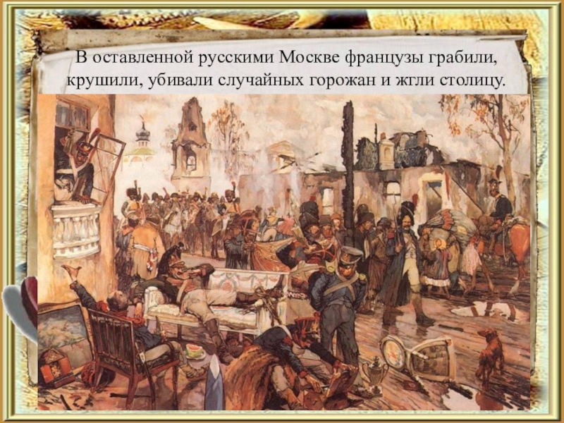 Слайд 29В оставленной русскими Москве французы грабили, крушили, убивали случайных горожан и