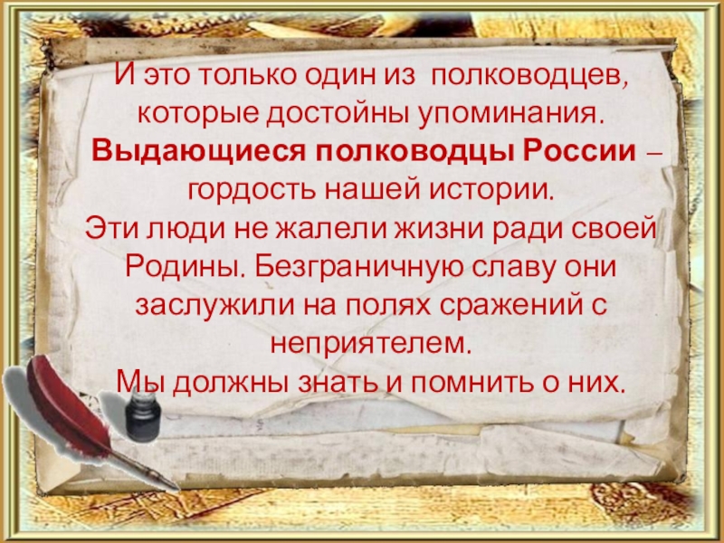 Слайд 32Знаменитого полководца народ до сих пор вспоминает как достойного и уважаемого