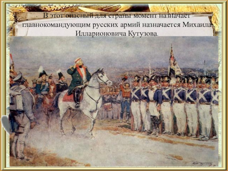 Слайд 9В этот опасный для страны момент назначает главнокомандующим русских армий назначается